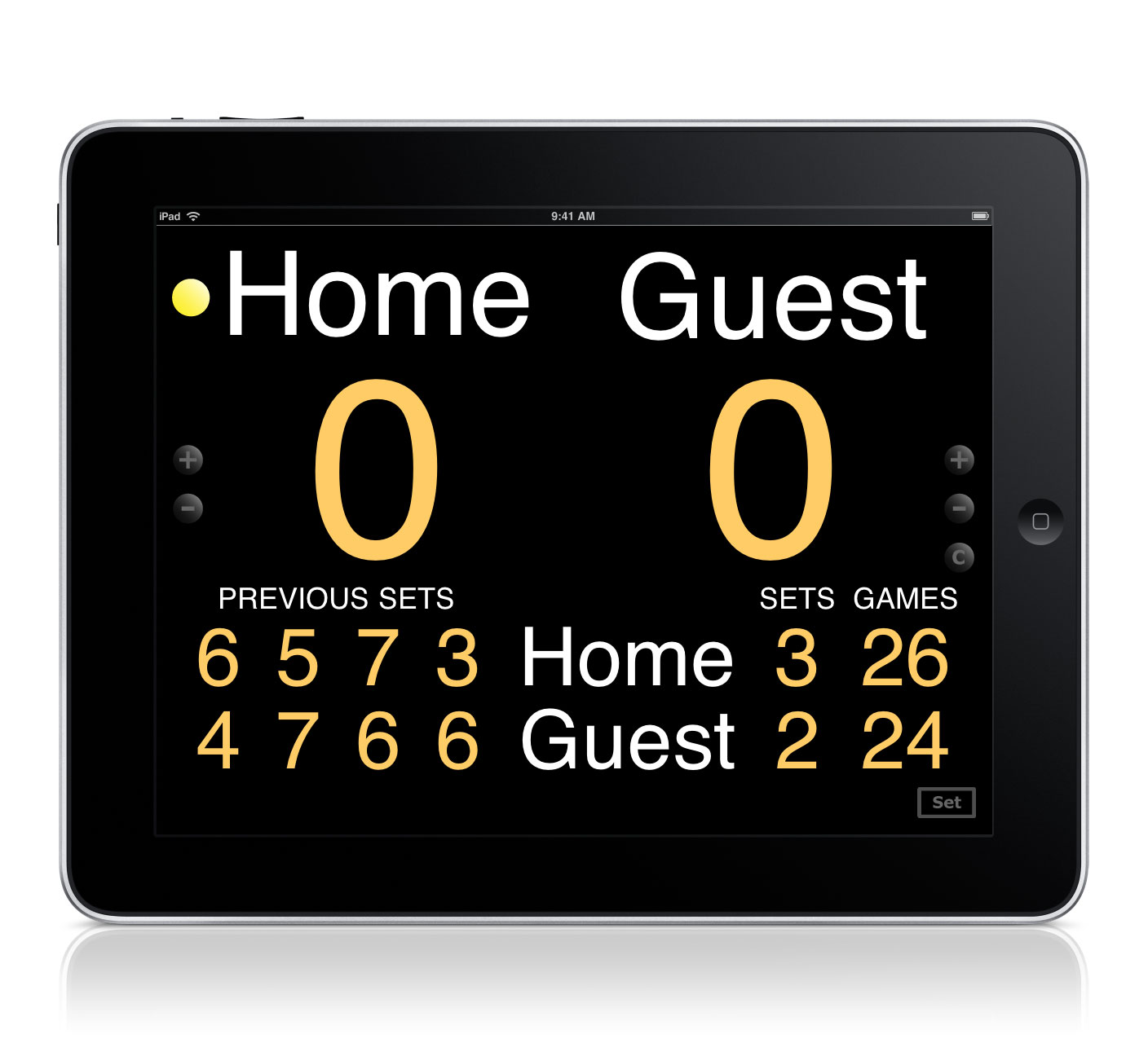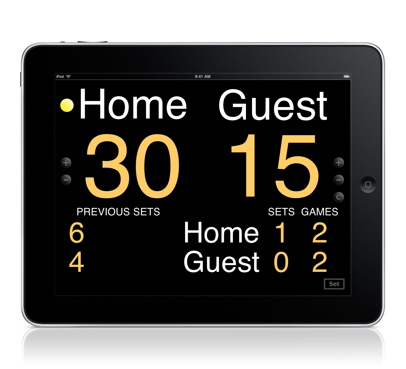 Score appears Points, Games, Previous games(Ⅰ, Ⅱ, Ⅲ, Ⅳ), Sets and Present games.
