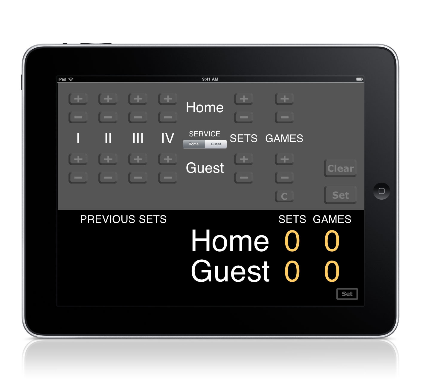 Score(Points, Games, Previous games(Ⅰ, Ⅱ, Ⅲ, Ⅳ), Sets and Present games/player)